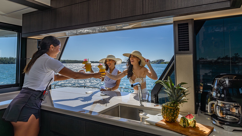 Every charter on the 2025 Galeon 68 is all-inclusive — your licensed USCG captain, fuel, and crew are included in the rate. Gratuity for your crew (15–20%) is customary but not mandatory. Add-ons like catering, decorations, and water sports equipment are available upon request.